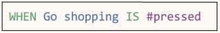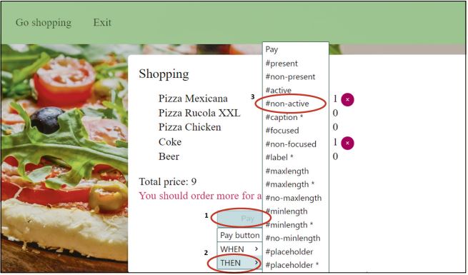 „Go shopping“ ist der Selektor, der das Go shopping UI-Element identifiziert, und „#pressed“ bedeutet einen Klick darauf. Die Validierung der erwarteten Ergebnisse ist etwas schwieriger, da der Tester den Validierungstyp oder das -ergebnis selbst auswählen muss. Um zum Beispiel zu überprüfen, ob die Schaltfläche „Bezahlen“ inaktiv ist, kann der Tester zuerst die Schaltfläche „Bezahlen“ auswählen, dann aus der angebotenen Liste auswählen, dass es sich um eine Validierung handelt (THEN), und schließlich das erwartete Ergebnis #non-active wählen, siehe Abbildung 2.
