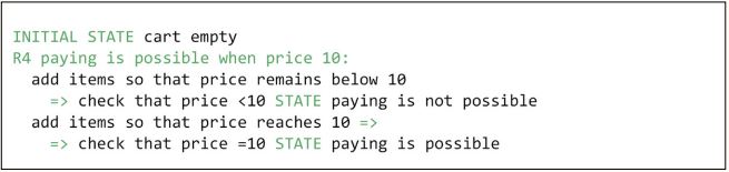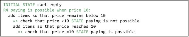 Die erste Zeile ist die Vorbedingung. Die zweite Zeile ist ein Label, das die Anforderung R4 mit dem Modell und dem Testfall verbindet. Die vierte Zeile besteht aus einem Modellschritt. Der erste Teil „Artikel hinzufügen, sodass der Preis unter 10 bleibt“ ist eine Benutzeraktion, der zweite Teil „Prüfen, ob Preis <10“ ist eine Validierung der erwarteten Ergebnisse, und der dritte Teil „Bezahlen ist nicht möglich“ ist die Nachbedingung. Ein Tester, der sich mit der Grenzwertanalyse auskennt, fügt dem Warenkorb Artikel hinzu, bis der Gesamtpreis die 10 erreicht. Wenn er das Ergebnis validiert, wird er prüfen, ob das System das Bezahlen nun zulässt.