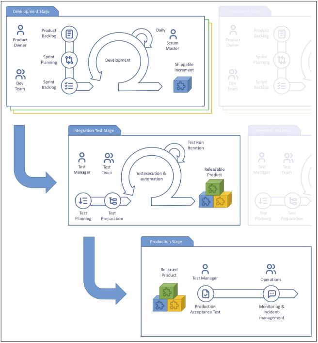 Eine weitere Herausforderung stellte die parallele Entwicklung mit mehreren Scrum-Teams dar, deren Produkte sich am Ende vollständig integriert für den Kunden wie eine Lösung darstellen sollen. Hier geht es also nicht nur um die Qualität einzelner Bausteine, sondern des großen Ganzen und übergreifender Prozesse. Aber wer ist dafür verantwortlich?