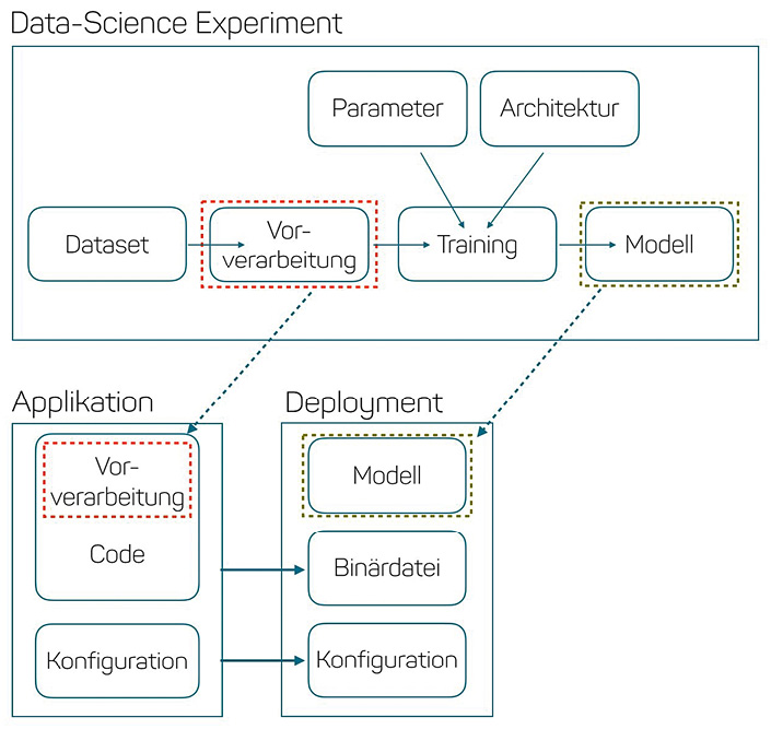 Abbildung 1 zeigt, wie die einzelnen Artefakte in datengetriebenen Projekten zusammenspielen. Aus einem erfolgreichen Data-Science-Experiment resultiert, analog zur Binärdatei bei der Applikationsentwicklung, ein neues Modell als deploybares Artefakt. Das reicht jedoch noch nicht aus. Die Genauigkeit eines ML-Modells hängt stark von der Vorverarbeitung der Daten ab. Werden beispielsweise Trainingsdaten im Experiment skaliert, dann gehören auch produktive Daten skaliert. Daher muss nicht nur das Modell, sondern auch der Code für die Datenvorverarbeitung als Artefakt versioniert werden.