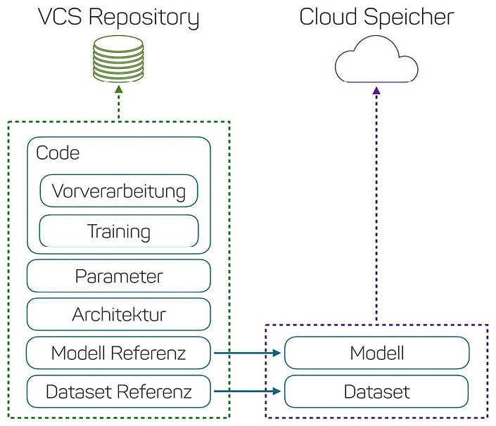 Im Gegensatz zu Quellcode erreichen Binärdateien wie Gewichte und Trainingsdaten oft Größen von mehreren Giga- bis Terabyte und sind damit nur schwer mit üblichen Versionskontrollsystemen (VCS) wie Git oder SVN versionierbar. Als Alternativen setzen sich immer mehr kostengünstige und ausfallsichere Cloud-Speicher durch, in denen die Daten abgelegt werden. Abbildung 2 fasst die Aufteilung zwischen Code und Binärdaten noch einmal zusammen.