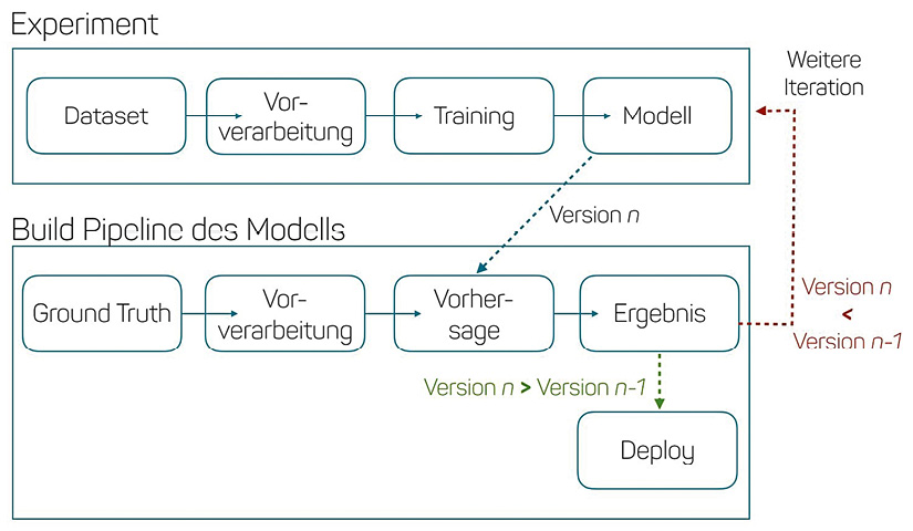 Eine Praktik, die Entwicklern das automatisierte Deployment erleichtert, ist die Validierung neuer Modell-Releases gegen einen Ground-Truth. Der Ground-Truth ist ein kleines, dem Modell fremdes und gelabeltes Dataset. Der Test gegen den Ground-Truth prüft, ob ein neues Modell auch wirklich bessere Ergebnisse berechnet als dessen Vorgänger. Nur dann wird es auch deployed. Ein solches Quality-Gate ermöglicht einen hohen Automatisierungsgrad beim Deployment, ähnlich wie er bereits in Standardprojekten erreicht wird.