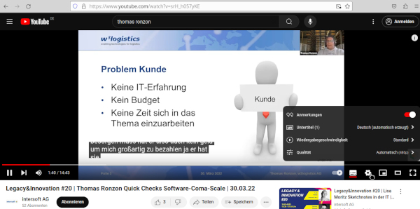 Aber der Reihe nach – alles fing damit an, dass ich ein mittels Microsoft Teams geführtes Interview herunter tippen wollte, um es als Text zu veröffentlichen. Welch eine stupide Arbeit! Dabei dachte ich daran, wie schön es wäre, wenn ich beliebige Videos selbst transkribieren könnte, wie es beispielsweise YouTube seit einiger Zeit macht. Hier reicht es ja bekanntlich, unter „Einstellungen“ die Untertitel zu aktivieren, und schon kann ich mitlesen, was gesprochen wird (s. Abb. 1).