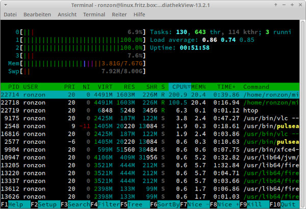 Abb. 2: Mehrere CPU-Kerne sind ausgelastet (ermittelt mittels htop)