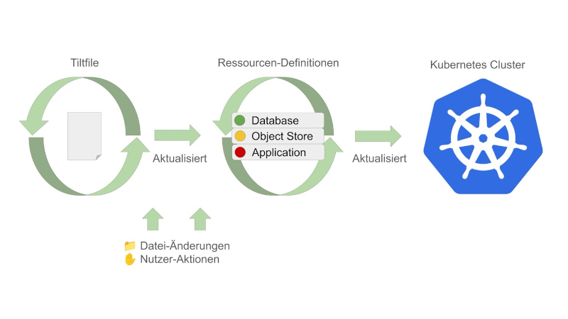 Die Abläufe, die Tilt für ein Projekt ausführen soll, werden in einem sogenannten Tiltfile definiert. Tilt beobachtet das Tiltfile und definierte Abhängigkeiten wie den Anwendungsquellcode, Build-Definitionen und Kubernetes-Manifeste und löst bei Datei-Änderungen oder Nutzer-Aktionen die notwendigen Updates aus, baut die Anwendung, baut Container-Images, aktualisiert sonstige Ressourcen und rollt die Änderungen automatisch aus. Das Ergebnis ist eine kontinuierlich aktualisierte, laufende Anwendung im Cluster, siehe Abbildung 1.
