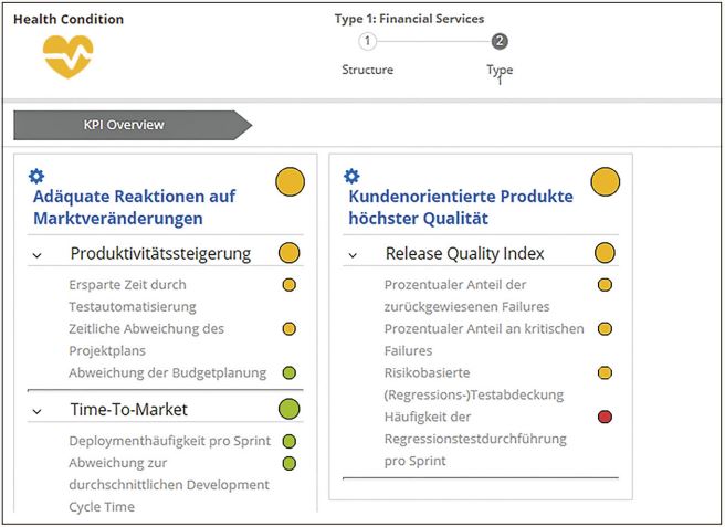 Abbildung 1 zeigt in einem KPI-Dashboard das Zusammenspiel von Geschäftszielen, KPIs und Metriken. Sie sind über eine Ampel-Darstellung visualisiert.