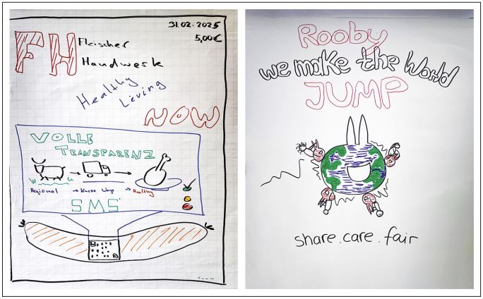 Mit Nutzern, Werten und Gefühlen ist eine gute Basis für das weitere Vorgehen gelegt. Was fehlt, ist ein übergeordnetes Ziel beziehungsweise eine Vision für das Produkt, die allen Beteiligten im Entwicklungsprozess weitere Orientierung gibt. Die Herausforderung besteht darin, dieses Ziel oder diese Vision im Rahmen eines Workshops mit idealerweise nicht mehr als zehn Teilnehmern zu finden. Die Lösung: eine Cover-Story. Die Workshop-Teilnehmer stellen sich Folgendes vor: Das Produkt, in unserem Beispiel die Freigabe-App, ist seit einem Jahr erfolgreich auf dem Markt und wird vom wichtigsten Branchenmagazin auf der Titelseite präsentiert. Gemeinsam texten und visualisieren alle Teilnehmer dieses Cover nun in 15 bis 20 Minuten auf einem Flipchart. Hier kommt das Chaos ins Spiel. Alle arbeiten gleichzeitig an dem Cover, es gibt keinen Plan und keine definierte Vorgehensweise. Das Cover entsteht spontan. Und ja, das funktioniert wirklich. Abbildung 2 zeigt beispielhaft zwei Cover zu anderen Praxisbeispielen, die auf Basis der beschriebenen Methode entstanden sind.