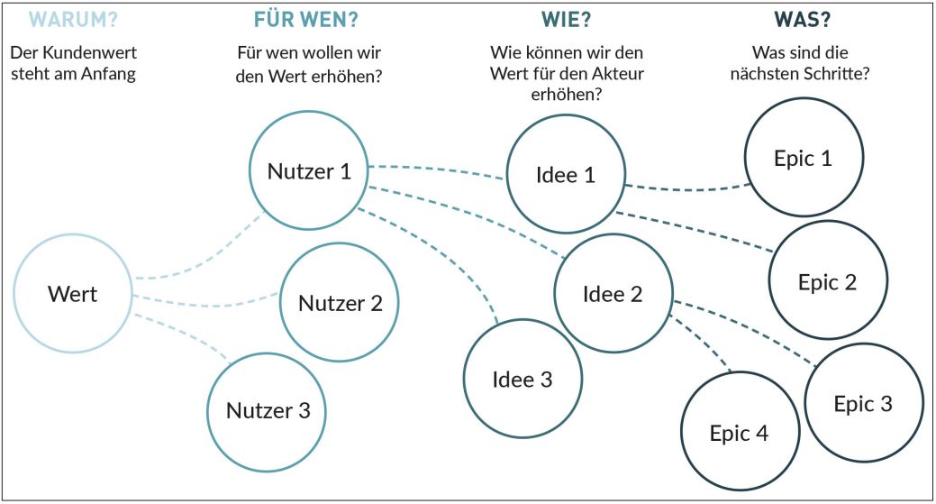 An dieser Stelle tauchen die bekannten Nutzer wieder auf, manchmal werden aber auch weitere Nutzergruppen identifiziert. Mit der dritten Frage „Wie (können wir den Produktwert für diesen Nutzertyp erhöhen)?“ werden weitere mögliche Handlungsansätze gesucht. Im abschließenden Schritt des Value Impact Mapping wird jeder Ansatz zerlegt, indem durch die Frage „Was (sind die nächsten Schritte)?“ Epics abgeleitet werden.