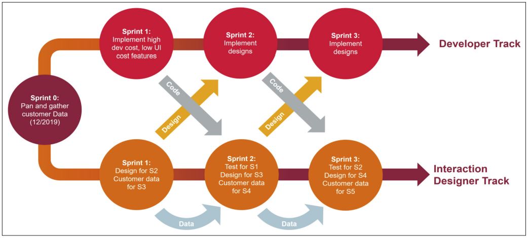 Der UX-Designer arbeitet eng mit Backend- und Frontend-Entwicklern zusammen. Er hilft dabei, dass alle im Team die Vision und die Nutzer kennen und auf das gleiche Ziel hinarbeiten. Der Designer arbeitet meist mindestens einen Sprint voraus und gleichzeitig hinterher. Voraus ist er beim Analysieren und Entwerfen von Designs. Wenn ein Inkrement fertig ist, werden UX-Reviews und Nutzertests durchgeführt. Abbildung 9 erklärt dieses Verfahren des „Staggered Sprints“-Modells, das Desirée Sy und Lynn Miller entworfen haben, anschaulich (vgl. [Got16], s. 120).