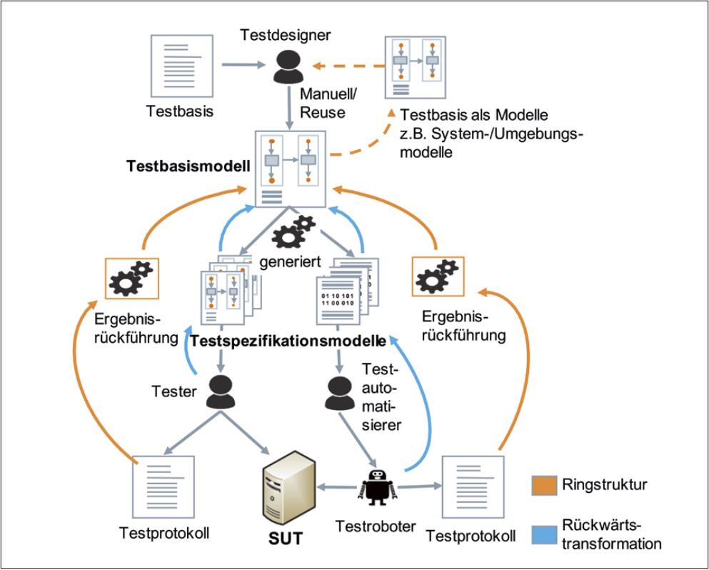 - Modellgetriebenes Testen setzt (formale) Modelle zur (teilweisen) werkzeuggestützten Generierung von Testartefakten ein (s. Abb. 1). Die Generierung ermöglicht die Erhöhung der Testüberdeckung und/oder die Senkung des Aufwands für die Testfallerstellung und -wartung.
