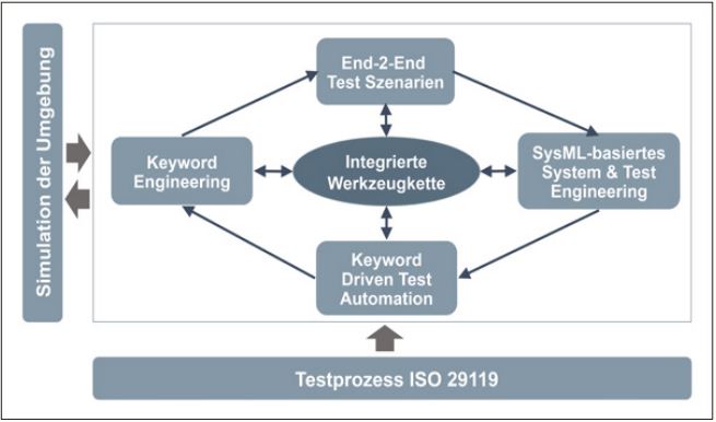 In einem Projekt der Siemens AG wurden modellbasierte Methoden im Engineering und Test von Leitsystemen eines Zuges eingesetzt [Götz16], siehe auch Abbildung 3. Das Ziel war, eine maximale Testautomatisierung aus der End-2-End-Sicht eines Triebfahrzeugführers unter Zuhilfenahme eines kombinierten SysML- und Keyword-basierten Modellierungsansatzes zu erreichen. Daher wurde eine modellbasierte, testgetriebene Entwicklungsmethode (M-TDD) entwickelt, die ein modellzentrisches System- und Testengineering mit SysML unterstützt, aus den Modellen die unmittelbare Ableitung der Keywords für die Testautomatisierung erlaubt sowie maximal durch eine integrierte Werkzeugkette unterstützt wird. Ferner wurde die Simulation der Umgebung und notwendigen Infrastruktur von Anfang an berücksichtigt, genauso wie die Prozessvorgaben des Teststandards ISO29119, die zur Erfüllung der übergeordneten regulatorischen Anforderungen einer EN50128 notwendig sind.