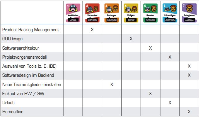 Eine weitere Möglichkeit zum Vereinbaren von Entscheidungsspielräumen bietet das Kartenspiel „Delegation Poker“ [Mana]. In einem Delegation Board werden als Erstes potenzielle Entscheidungssituationen aufgelistet (siehe Tabelle 2).
