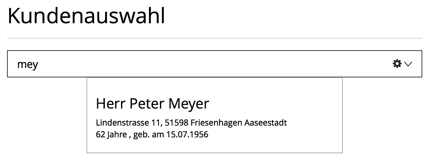 Unter [CRMS] ist eine einfache, prototypische Versicherungsanwendung verfügbar, die diese Mechanismen illustriert. Abbildung 1 zeigt einen Teil der Einstiegsmaske, ein Eingabefeld, über das man nach versicherten Personen suchen kann. Dabei wird – wie man es heutzutage erwarten würde – bereits beim Tippen eine Suche angestoßen und eventuelle Treffer werden angezeigt.