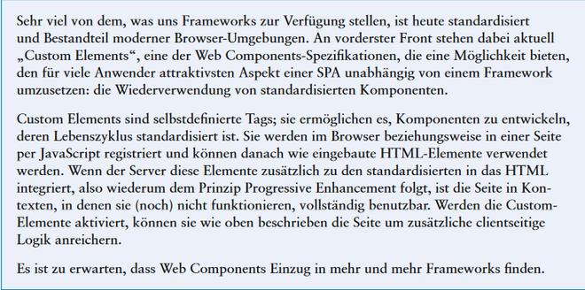 Mit JavaScript lässt sich dieses aber auch in alten Browsern in einen typischen Datepicker verwandeln, während moderne Browser daraus das für die jeweilige Plattform am besten funktionierende Datumsfeld erzeugen (z. B. mit den typischen „Rädern“ auf Mobiltelefonen). Über „Custom Elements“ (siehe Kasten 2) wird mittlerweile ein standardisiertes Programmiermodell für Komponenten angeboten, das für die Unterstützung dieses Ansatzes verwendet werden kann.