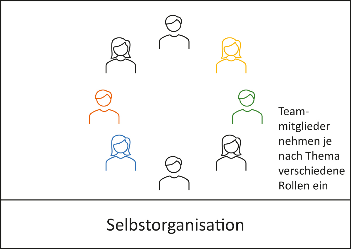 Gemäß dem Belbin-Modell setzen sich effiziente Teams aus unterschiedlichen Rollen zusammen. Man stelle sich ein Team vor, dass nur aus Personen besteht, die ihre Stärken darin haben, das Team zusammenzuführen und die Entscheidungsfindung zu unterstützen. In diesem Team würde wahrscheinlich wenig umgesetzt werden. Umgekehrt wird ein Team, in dem es keinen solchen Koordinator gibt, Schwierigkeiten haben, tragfähige und im Team akzeptierte Entscheidungen zu treffen. Damit ein Team selbstorganisiert arbeiten kann, braucht es demnach die verschiedenen Teamrollen, die die unterschiedlichen Aspekte von Führung wahrnehmen. Je nach Projektart und Projektphase kann es wichtig sein, dass bestimmte Rollen im Team präsent sind [Bel21]. Beispielsweise sind „Neuerer“, also Personen, die Ideen in das Team einbringen, unverzichtbar, wenn es darum geht, neue Lösungsvorschläge oder Alternativen zu entwickeln. Geht es stattdessen um den Roll-out, in dem Installationen und Schulungen zu planen und durchzuführen sind, so stehen andere Rollen und ihre Stärken im Vordergrund.