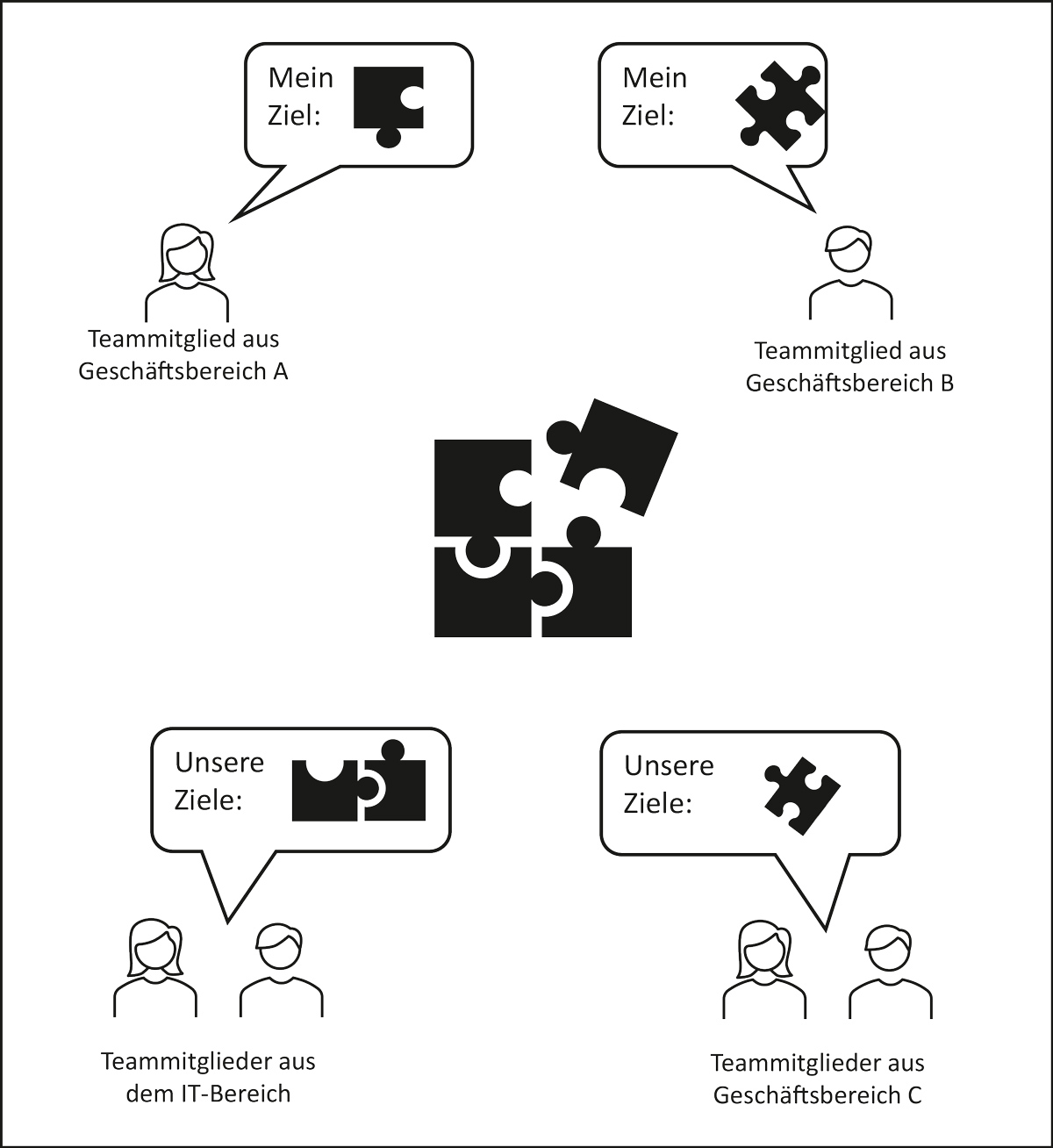Abbildung 2 zeigt beispielhaft, wie Mitarbeitende ihre jeweiligen Vorstellungen in das Projekt einbringen, zum Beispiel ihre Erwartungen daran, wie eine App für ihre Kunden gestaltet wird. Anforderungen sind beispielsweise, dass die Lösung noch in diesem Jahr produktiv gesetzt wird oder dass die einzelnen Geschäftsbereiche sie individuell anpassen können. Fachliche und technische Anforderungen gilt es in einer tragfähigen Gesamtlösung zusammenzubringen.