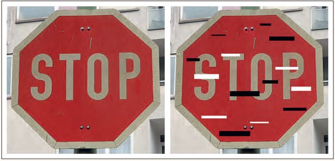 Außerdem erfordert der Einsatz von neuronalen Netzen die Berücksichtigung neuer Schwachstellen in der Informationssicherheit. Ein typisches Security-Problem ist zum Beispiel das der „adversarial examples“, bei dem gezielt Eingabedatensätze konstruiert oder manipuliert werden, die eine bereits trainierte KI zu falschen Ergebnissen führt. Ein oft zitiertes Beispiel ist hier die KI-basierte Bildverarbeitung beim autonomen Fahren, die durch Anbringen von kleinen schwarzen und weißen Streifen auf einem Stoppschild dazu gebracht werden kann, dieses falsch zu klassifizieren (siehe Abbildung 1).