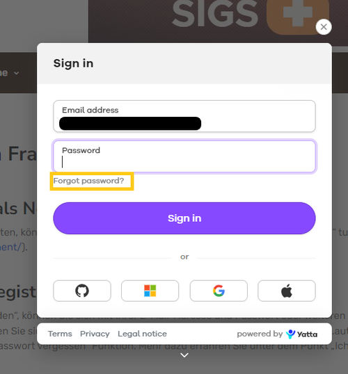Auf SIGS.de in der Navigation unter "Anmelden", können Sie sich mit Ihrer E-Mail-Adresse oder weiteren Anmeldemöglichkeiten (je nachdem welche Sie gewählt haben bei der Registrierung) anmelden. Sollten Sie Ihr Passwort vergessen haben, nutzen Sie bitte die Funktion "Passwort vergessen" im Sign-in-Fenster unter dem Passwortfeld. Mehr dazu erfahren Sie unter dem Punkt "1.3 Ich habe mein Passwort vergessen. Was kann ich tun?"