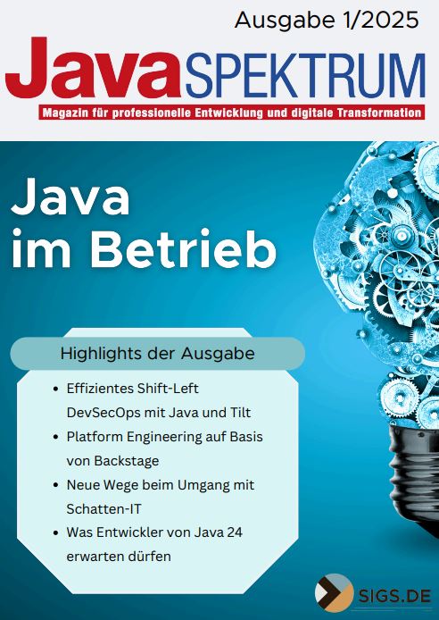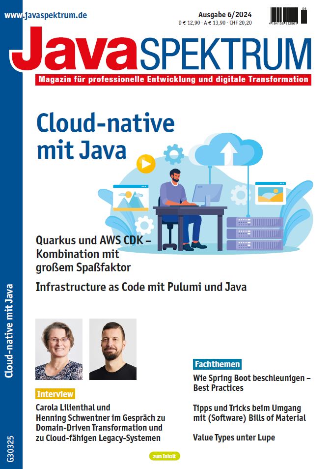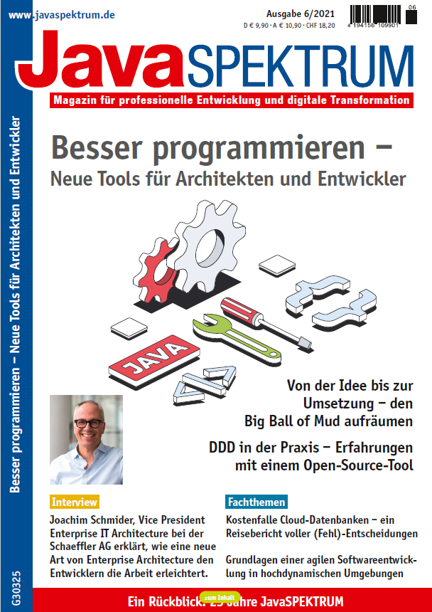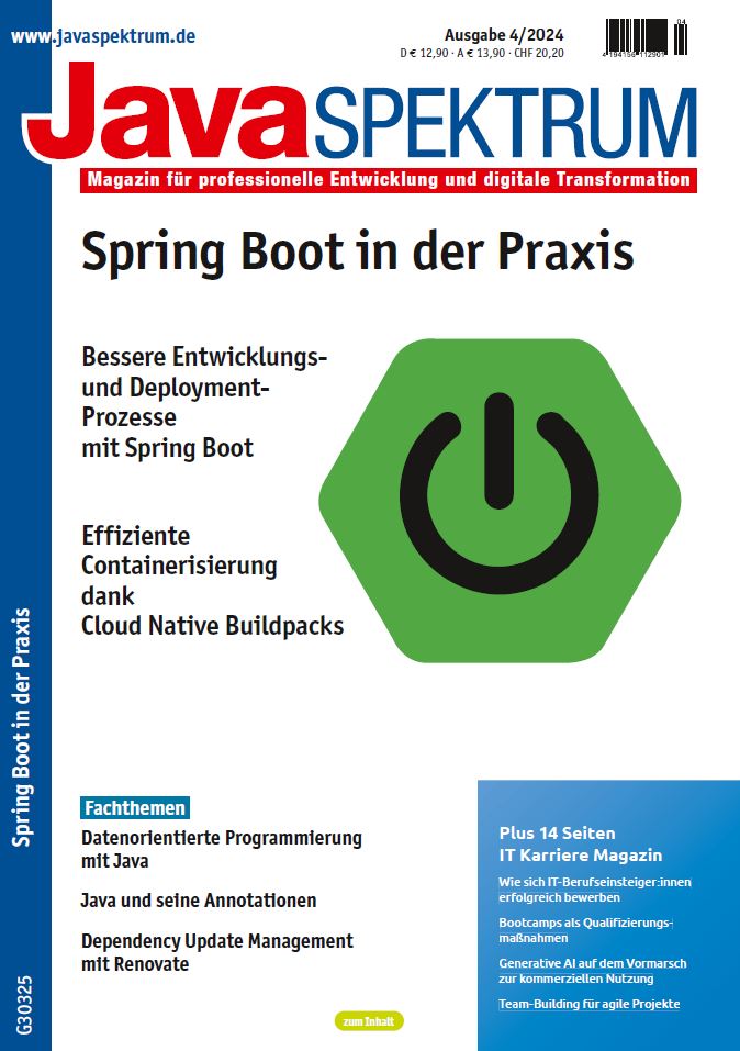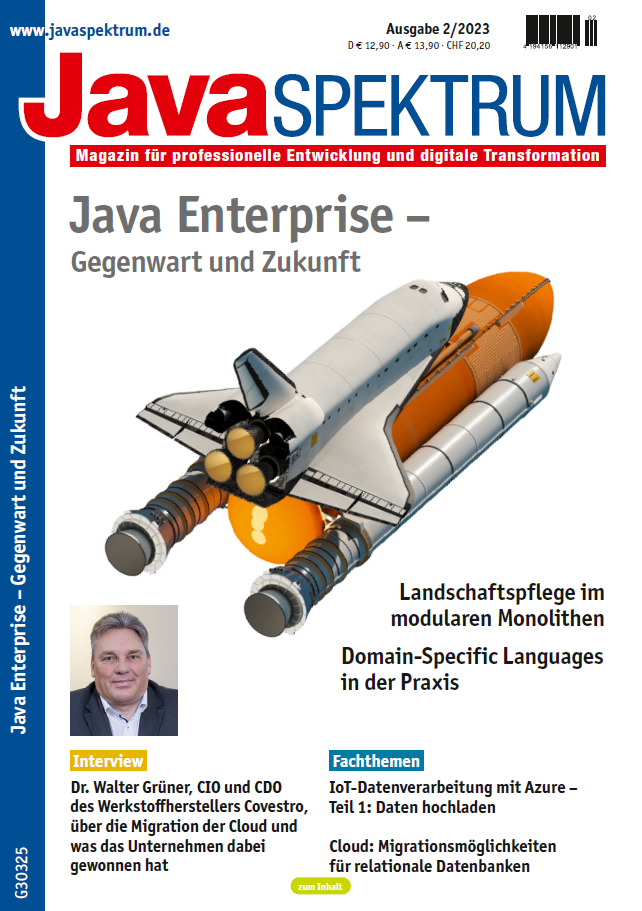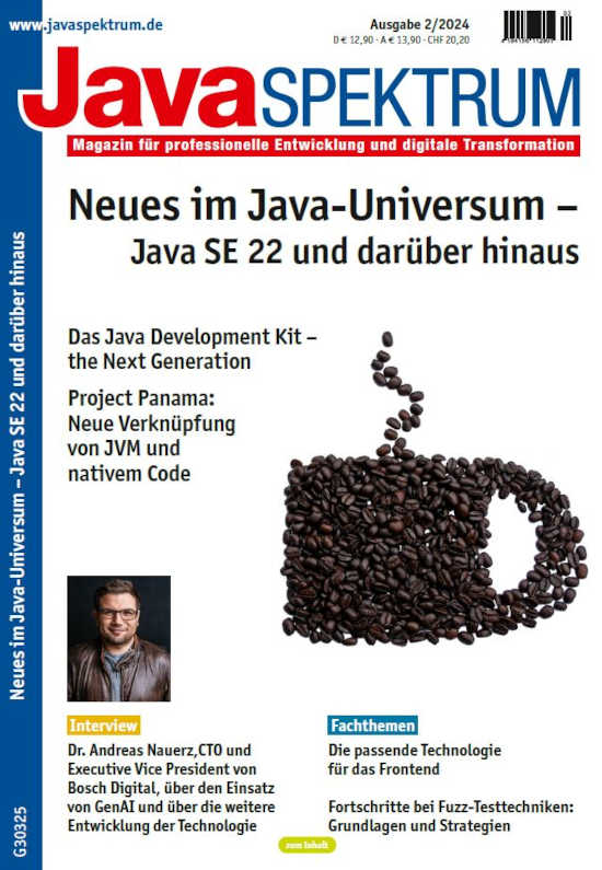 JavaSPEKTRUM ist die Marke für professionelle Softwarearchitekten und -entwickler, die mit der Java-Plattform arbeiten oder Java mit anderen Plattformen integrieren wollen. Wir stellen neue Entwicklungen und Konzepte vor und prüfen deren Relevanz für den täglichen Einsatz.