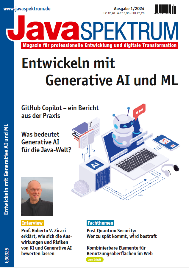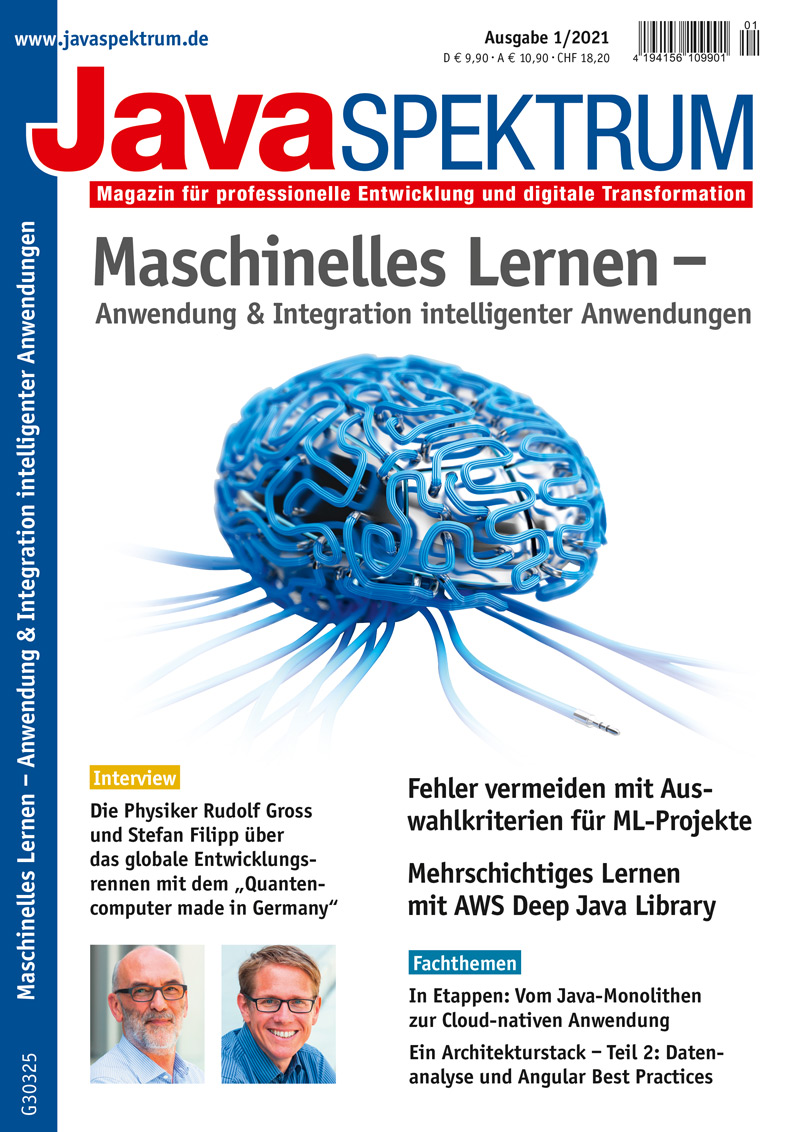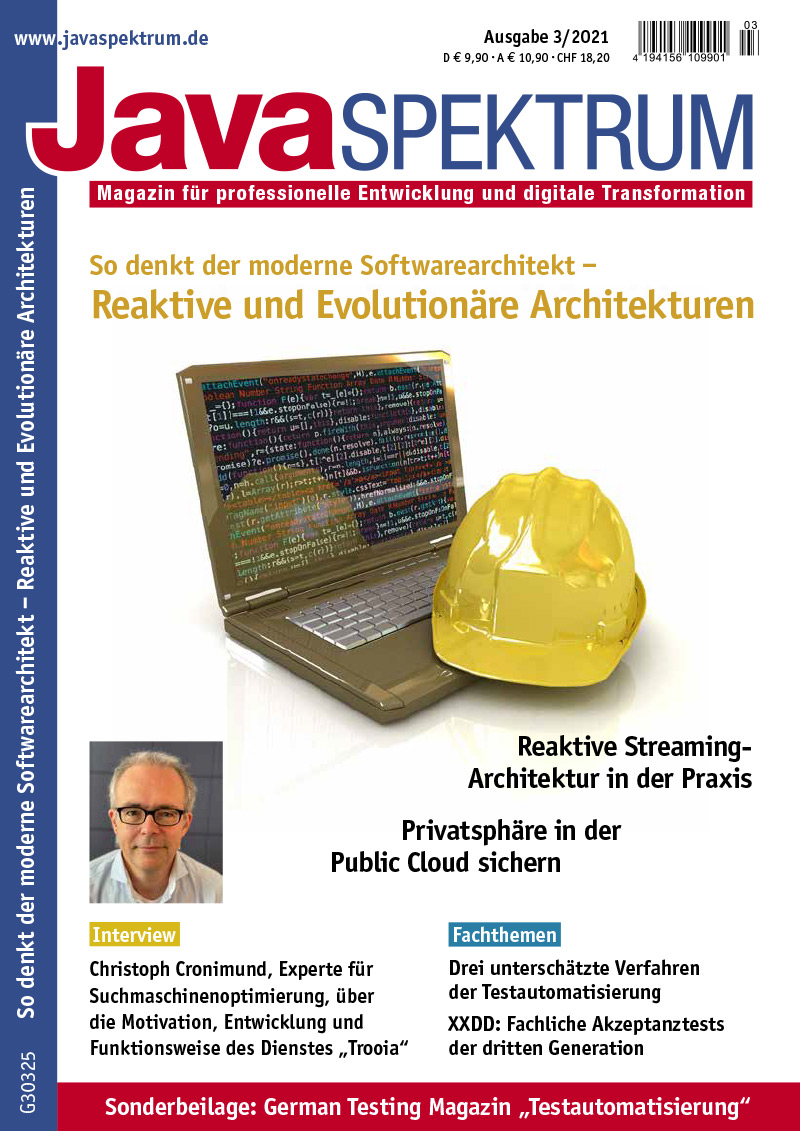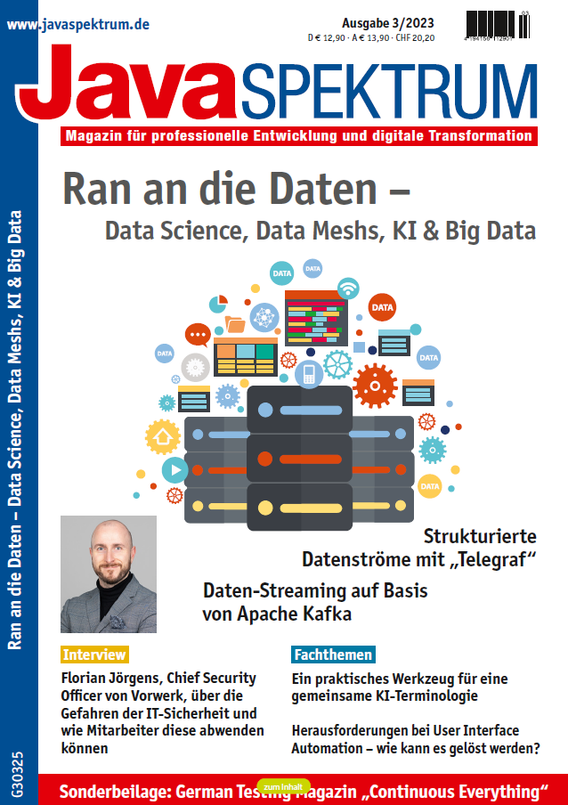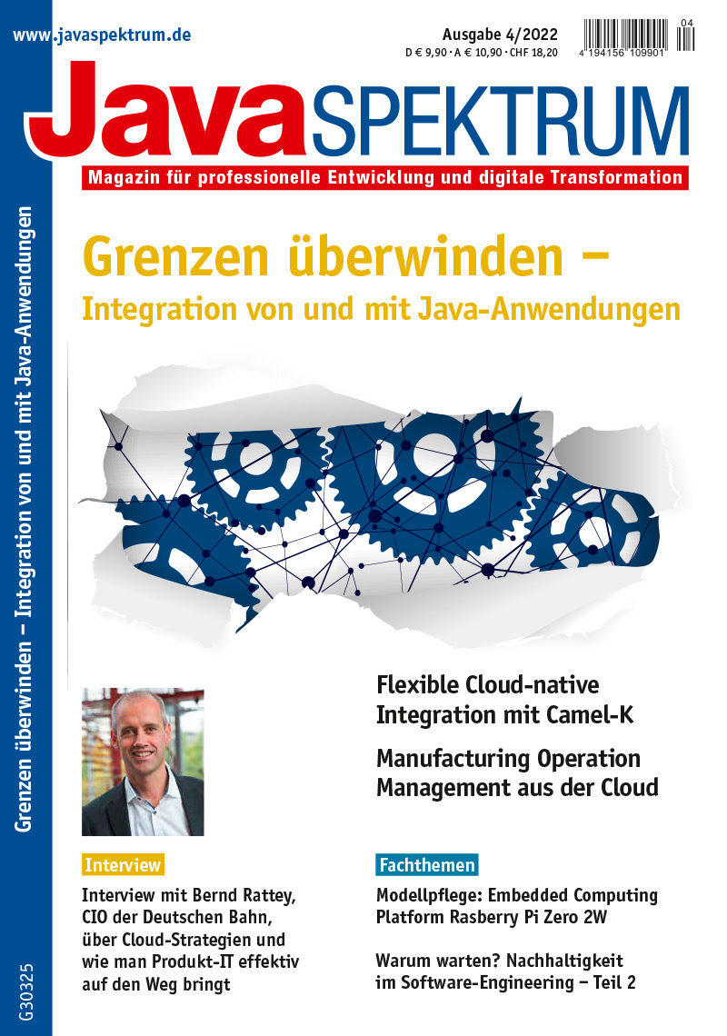 JavaSPEKTRUM ist die Marke für professionelle Softwarearchitekten und -entwickler, die mit der Java-Plattform arbeiten oder Java mit anderen Plattformen integrieren wollen. Wir stellen neue Entwicklungen und Konzepte vor und prüfen deren Relevanz für den täglichen Einsatz.